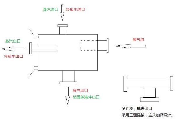 如圖設(shè)計(jì)所示,假設(shè)其中廢氣通道為 A 通道,100℃廢氣從右側(cè)進(jìn)口進(jìn)入,經(jīng)過冷卻循環(huán)從底部出口流出,此時(shí)另一個(gè) B 通道(左側(cè)和上端)為冷介質(zhì)(常溫水),用以冷卻廢氣,使之在換熱器內(nèi)部 A 通道表面凝結(jié)成晶體,飽和之后,關(guān)閉廢氣進(jìn)口,原 B 通道的冷介質(zhì),改為熱介質(zhì)(蒸汽)進(jìn)行對(duì) A 通道的加熱,使 A 通道的硝基苯晶體溶解成液態(tài)回收。
