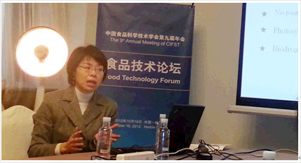 ??????? 我司研發總監姜悅博士應邀出席中國食品科學技術學會第九屆年會,并與上海交通大學中美食品安全聯合研究中心主任史賢明教授共同主持食品技術論壇(英文)。會議期間,姜博士作了題為“微藻降膽固醇功效研究”的英文報告。報告中姜博士提出,根據動物實驗結果表明: 潤科生物培養的微藻產品是一種可以從根本上促進膽固醇排泄的物質,有很廣的應用前景。報告受到國內外與會專家學者的高度關注和熱烈的討論, 得到與會者的一致好評。