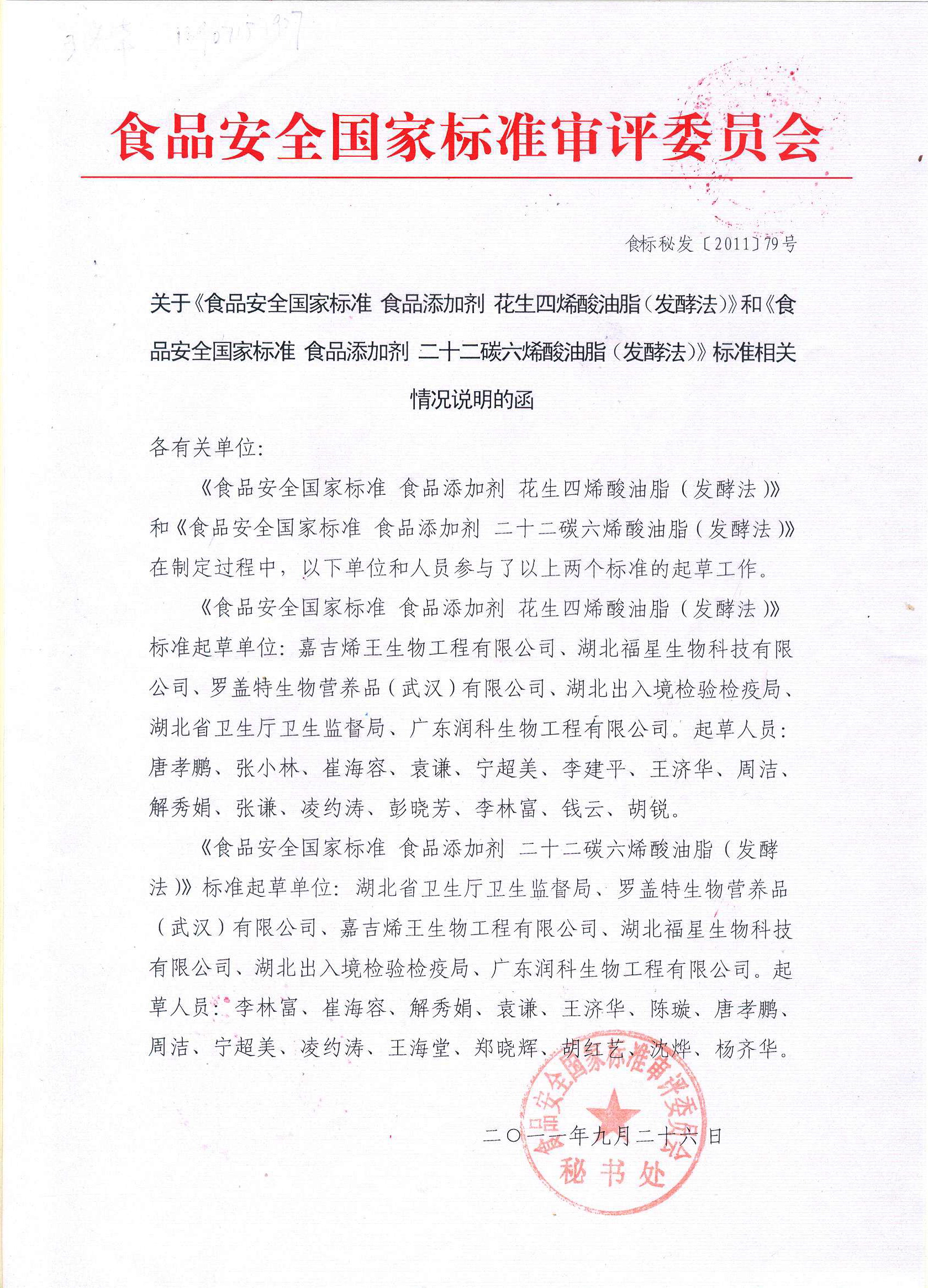 ?????? 潤科生物參與相關(guān)產(chǎn)品國家級、行業(yè)級標(biāo)準(zhǔn)起草工作,這既是榮譽(yù)更是責(zé)任與鞭策!2011年9月,公司參與食品安全國家標(biāo)準(zhǔn)審評委員會的兩項國家標(biāo)準(zhǔn)《食品安全國家標(biāo)準(zhǔn) 食品添加劑 二十二碳六烯酸油脂(發(fā)酵法)》和《食品安全國家標(biāo)準(zhǔn) 食品添加劑 花生四烯酸油脂(發(fā)酵法)》的制定,已在行業(yè)中普及使用。