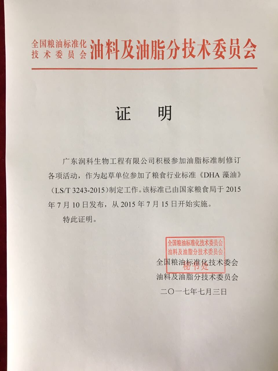 ???????潤科公司參與全國糧油標(biāo)準(zhǔn)化技術(shù)委員會油料及油脂分技術(shù)委員會的《DHA藻油》行業(yè)標(biāo)準(zhǔn)制定工作,該標(biāo)準(zhǔn)并已由國家糧食局于2015年7月10日發(fā)布,從7月15日開始實施。