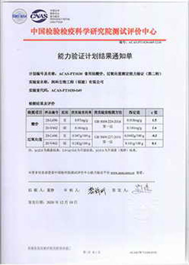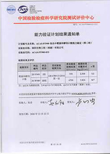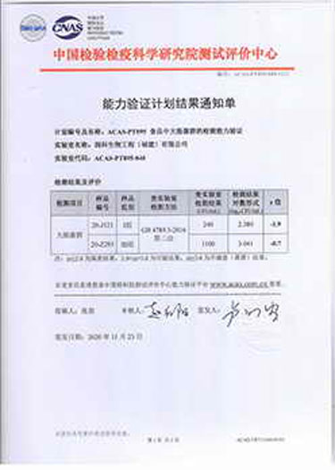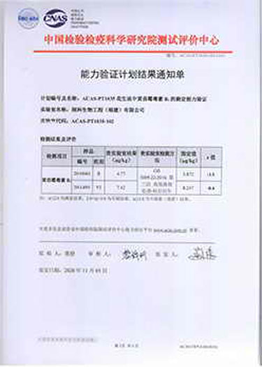 ? ? ? ?潤科生物中心實驗室檢測水平不斷提升,積極參加中國檢驗檢疫科學研究院測試評價中心開展的能力驗證計劃,累計已參與了菌落總數、黃曲霉毒素B1、鉛、大腸菌群、酸價、過氧化值、霉菌和酵母計數等多項指標檢測能力驗證,驗證評價結果均為滿意。