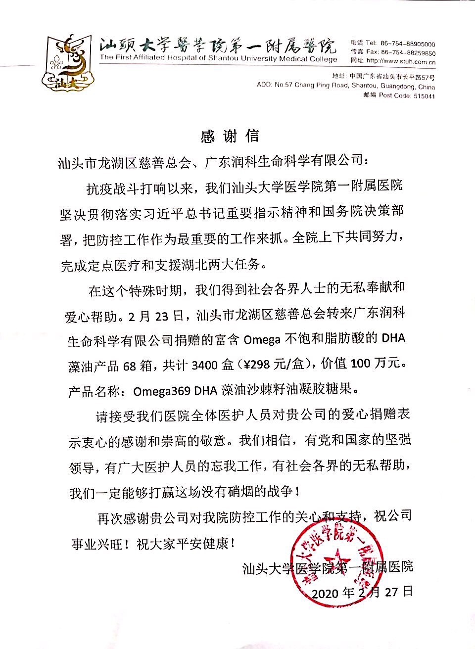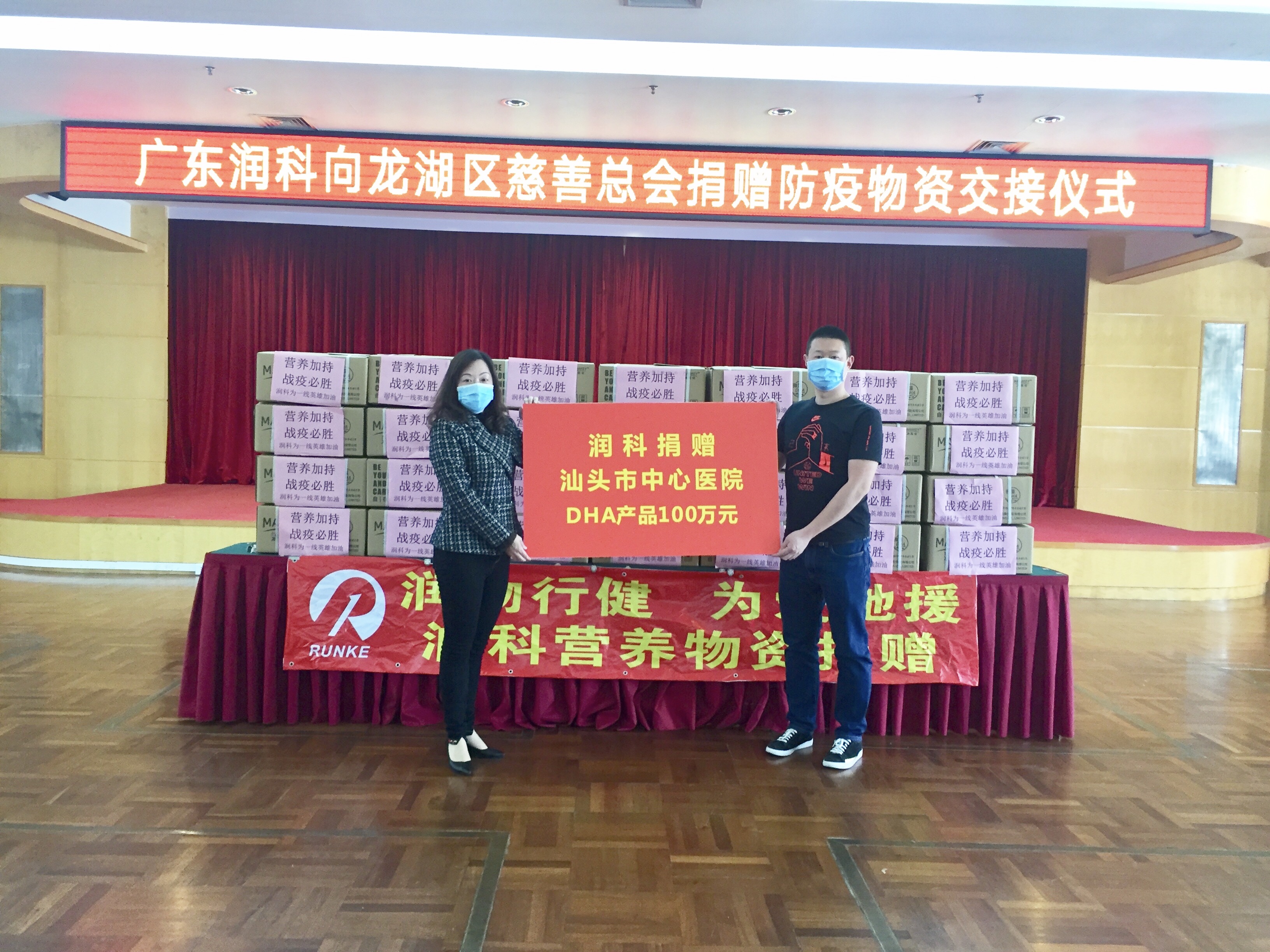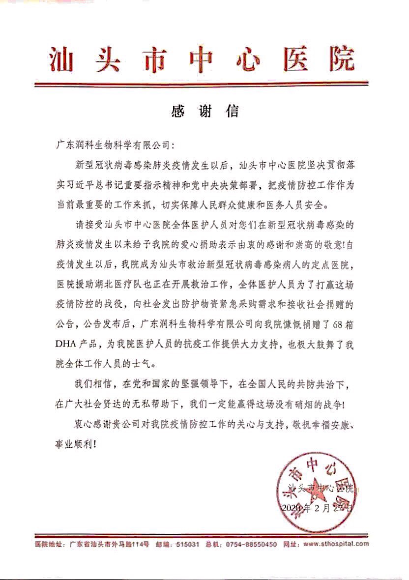 ?????? 2020年2月23日,潤科通過汕頭市龍湖區慈善總會,向汕頭市最先收治新冠肺炎患者的兩家醫療機構——汕頭市中心醫院和汕頭大學醫學院第一附屬醫院,捐贈了價值共200萬元的DHA營養產品,為抗擊疫情的醫護人員們提供營養支持。