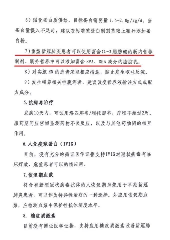 ?????? 2月14日,國家衛健委發布了新型冠狀病毒肺炎重型、危重型病例診療方案(試行 第二版),將Omega-3脂肪酸的腸內營養制劑納入重型新冠肺炎患者的治療措施之一,建議將DHA和EPA作為腸外營養補充,助力免疫系統正常運行。