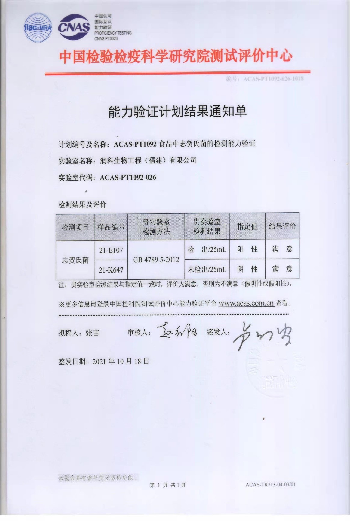 潤科生物中心實驗室檢測水平持續鞏固,積極參加中國檢驗檢疫科學研究院測試評價中心開展的能力驗證計劃,參與了花生油中黃曲霉毒素B1的測定、食品中志賀氏菌的檢測能力驗證等多項指標檢測能力驗證,驗證評價結果均為滿意。