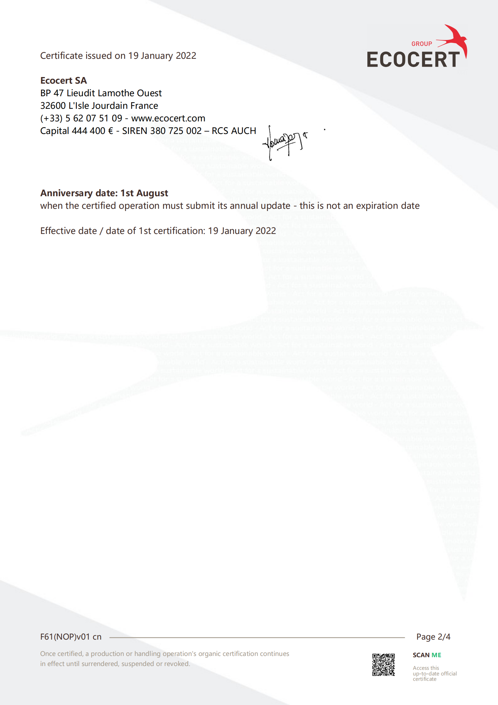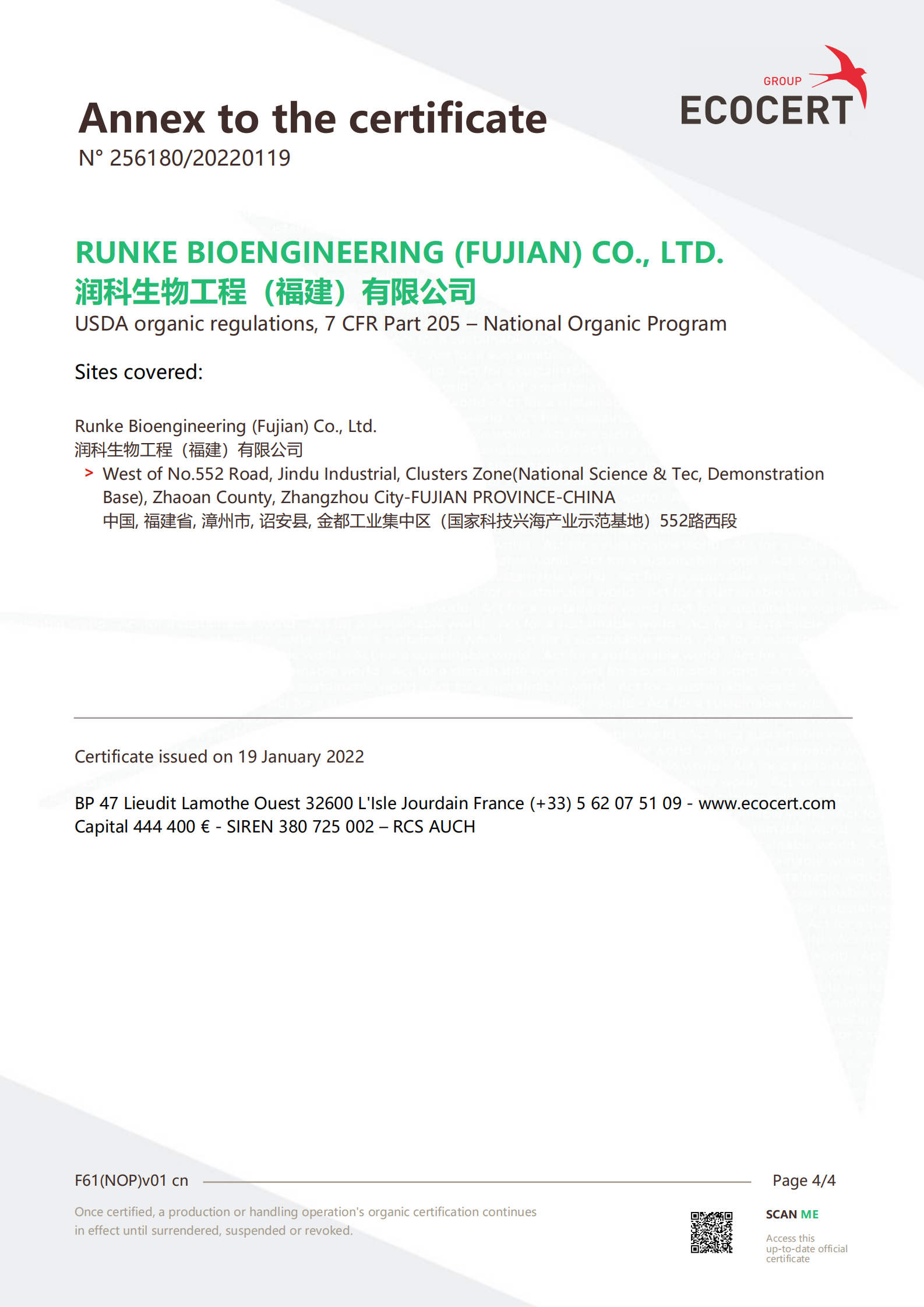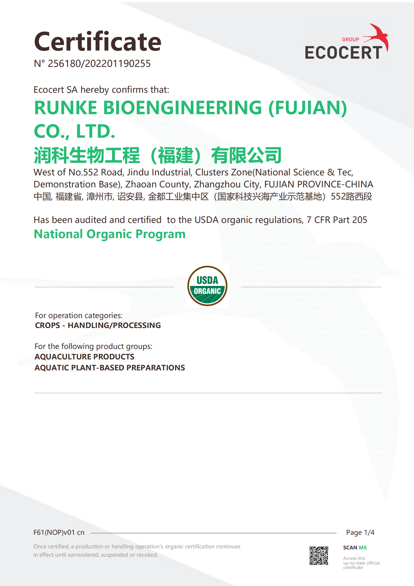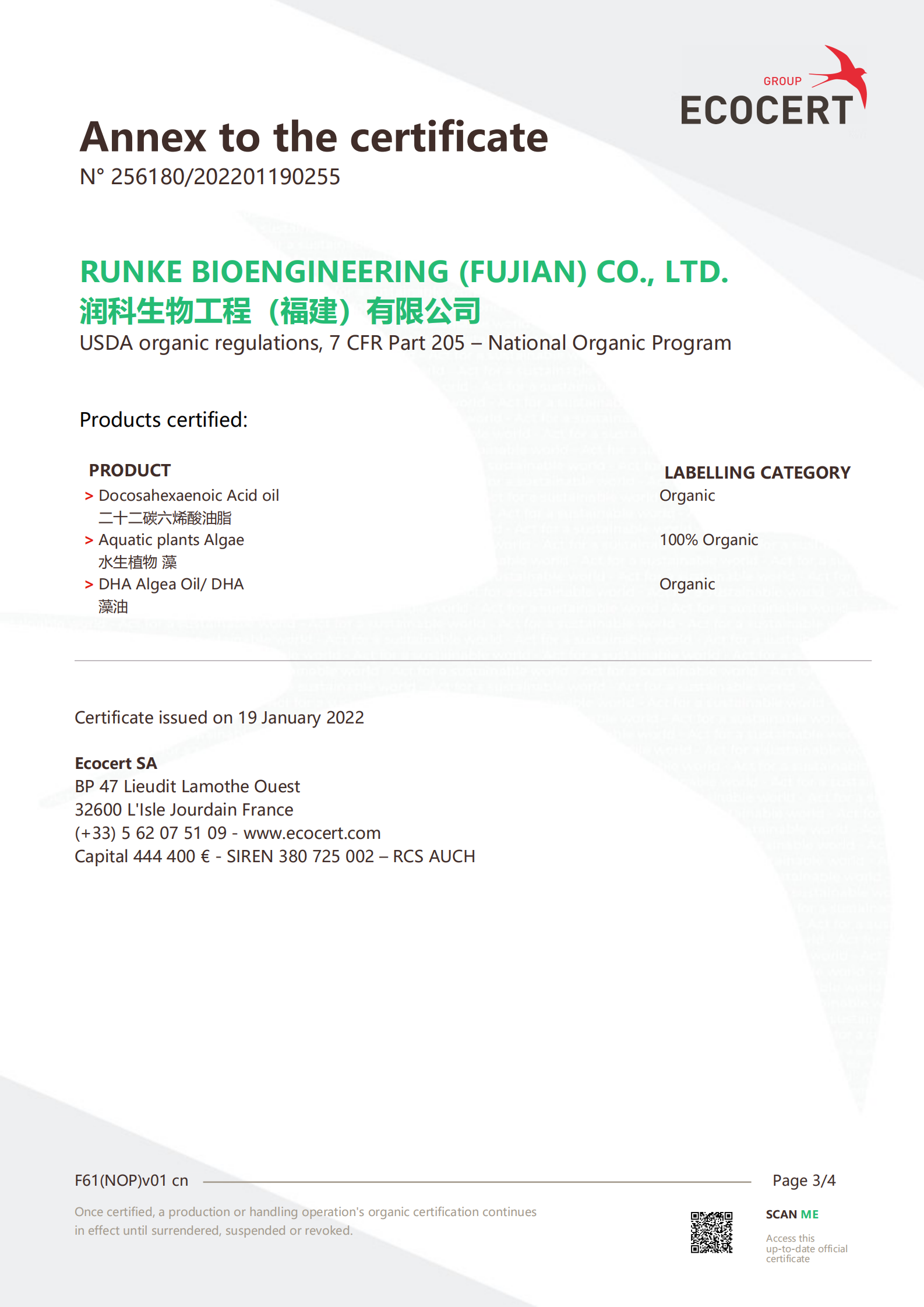 2022年1月19日,潤科生物工程(福建)有限公司收到法國國際生態認證中心(ECOCERT SA)關于潤科生物“二十二碳六烯酸油脂”、“水生植物海藻”、“DHA 藻油”產品通過美國有機認證的通知,這意味著,潤科生物DHA 藻油產品拿到了通往國際市場的有機食品領域的通行證。