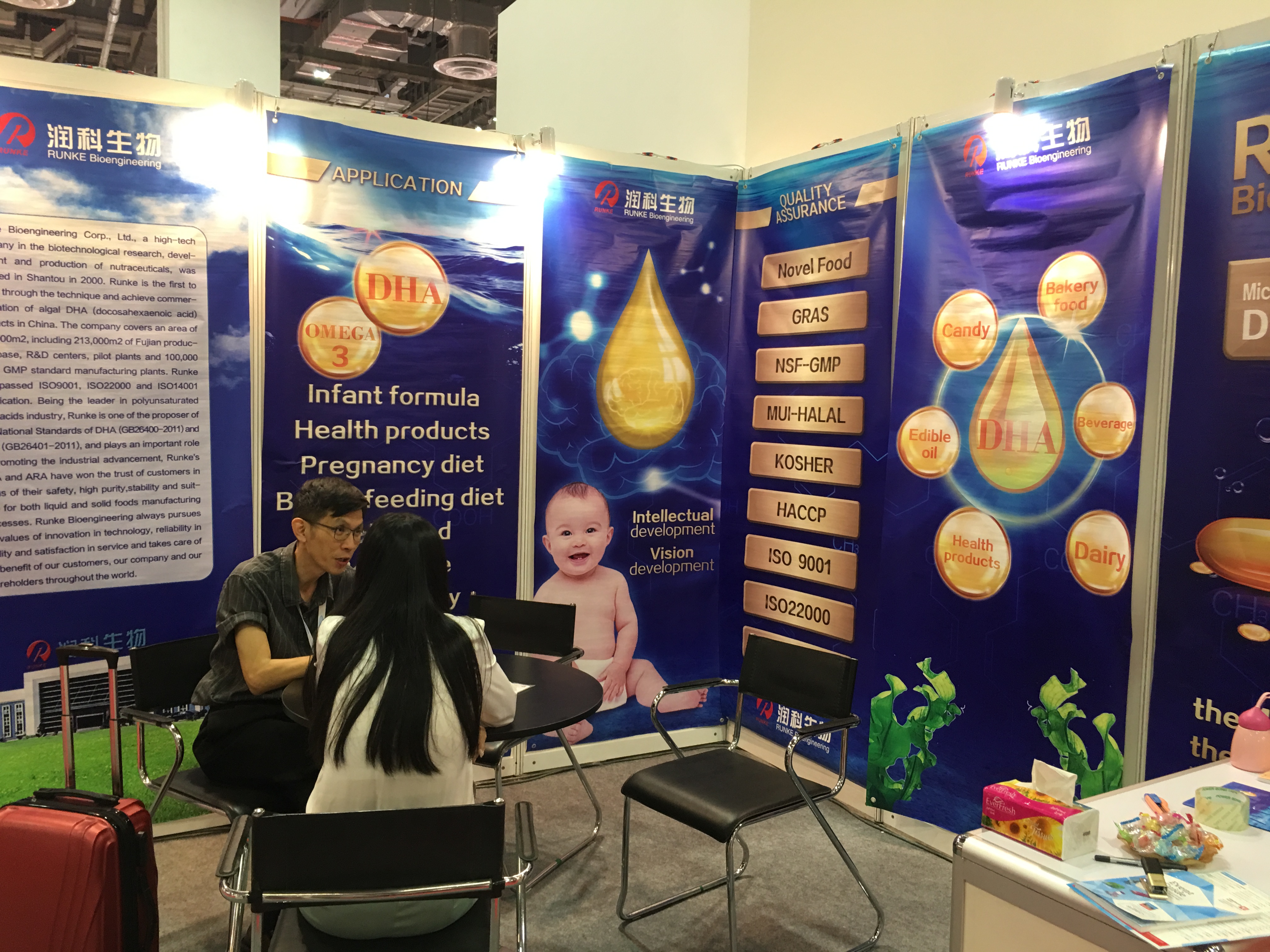 ??????? 通過與客戶當面交談,了解到東南亞的市場動態,同時加強了與客戶之間的合作聯系,建立彼此間更為牢固的信任關系,同時也發覺更多的潛在客戶,有不少客商表示有了解過藻油,也知道藻油相對魚油更健康,有意向嘗試加入產品中。此次展會對外宣傳潤科產品是一個很好的平臺。