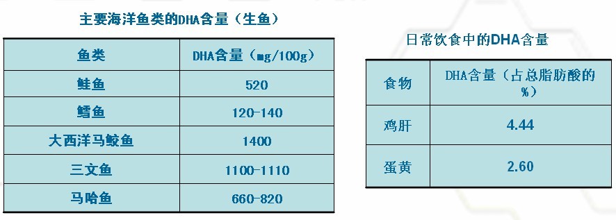 ??????? 在日常膳食中,DHA主要存在于深海魚類等海產品中。另外,在動物肝臟和蛋黃中也有少量DHA。